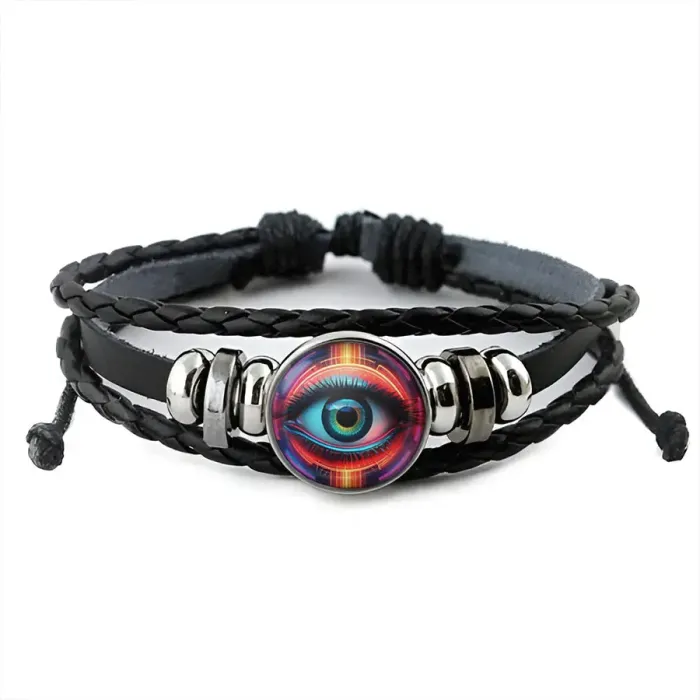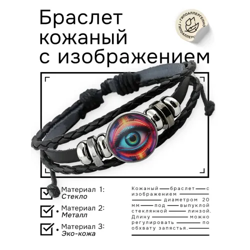 Кожаный браслет с декоративным элементом «Око». Изготовлен из синтетической кожи, металла и стекла.