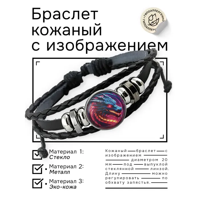 Кожаный браслет с декоративным элементом в виде дракона в профиль.