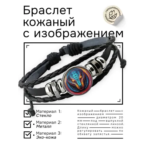 Кожаный браслет с декоративным элементом. Изготовлен из синтетической кожи, украшен изображением под выпуклой стеклянной линзой.