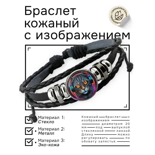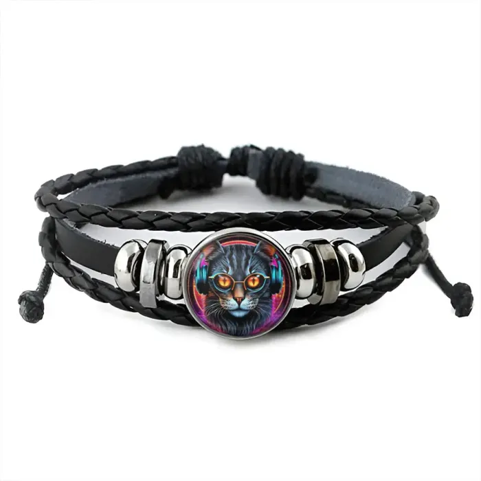 Кожаный браслет с изображением кота в очках и наушниках. Изображение защищено выпуклой стеклянной линзой.