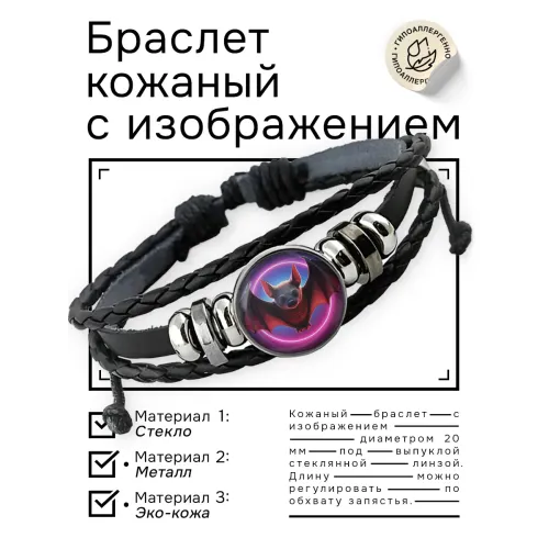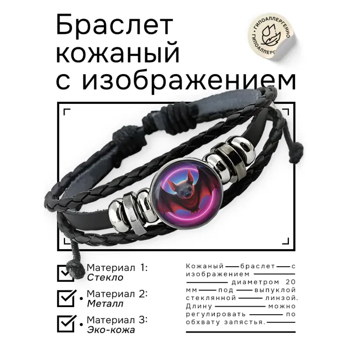 Кожаный браслет с изображением летучей мыши. Изготовлен из синтетической кожи с металлическими элементами.