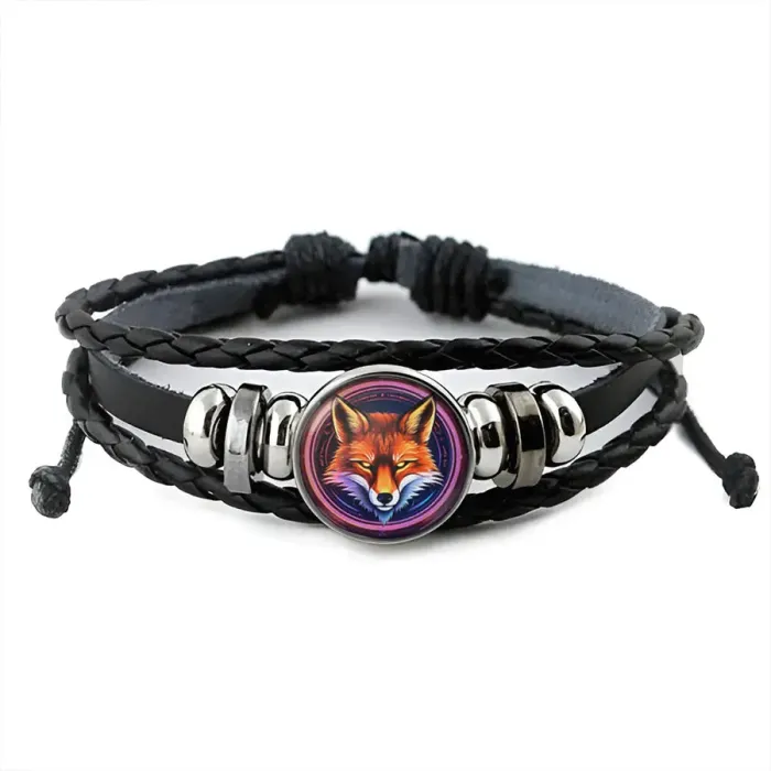 Кожаный браслет с изображением лисы. Материал — синтетическая кожа с металлическими элементами. Изображение защищено выпуклой стеклянной линзой.