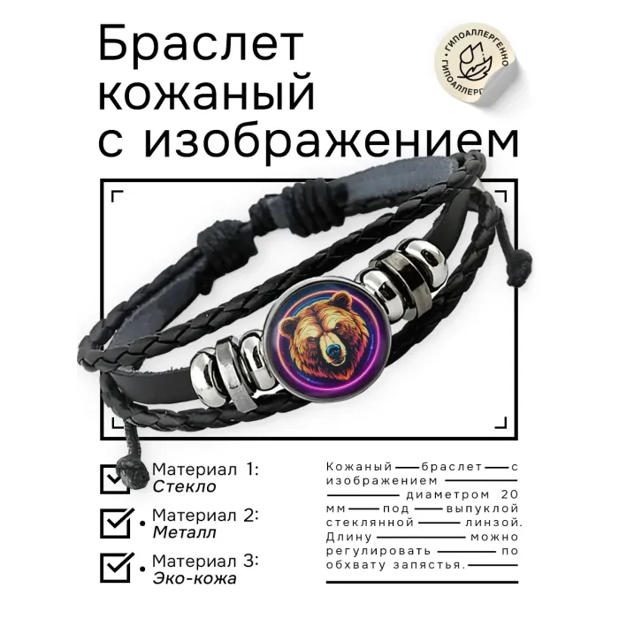 Кожаный браслет с декоративным элементом в виде медведя. Изготовлен из синтетической кожи и металла, изображение защищено выпуклой стеклянной линзой.