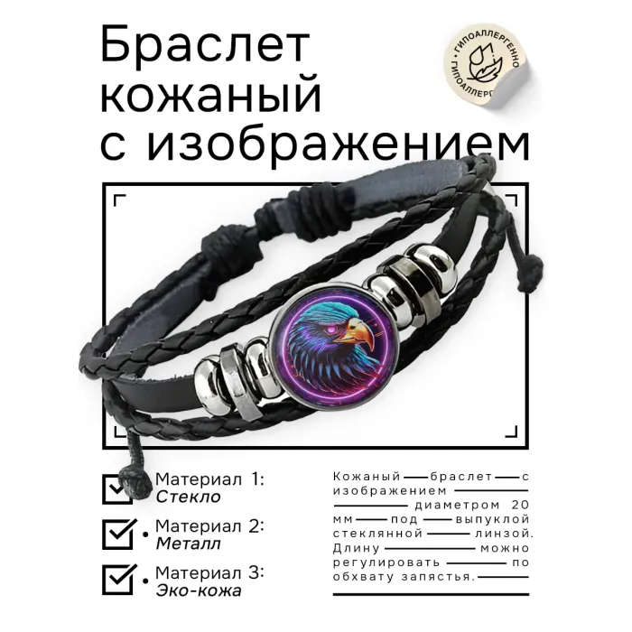 Кожаный браслет с декоративным элементом в виде орла. Изготовлен из синтетической кожи, металла и стекла.