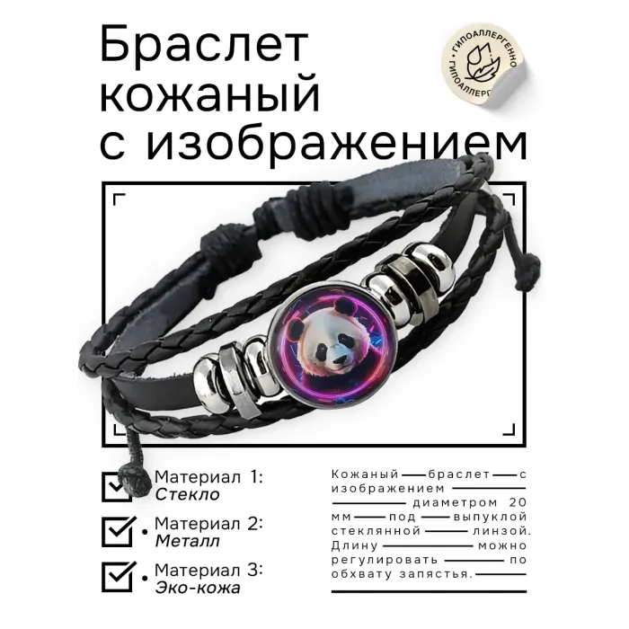 Кожаный браслет с декоративным элементом в виде панды под стеклянной линзой.