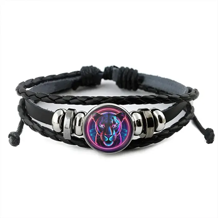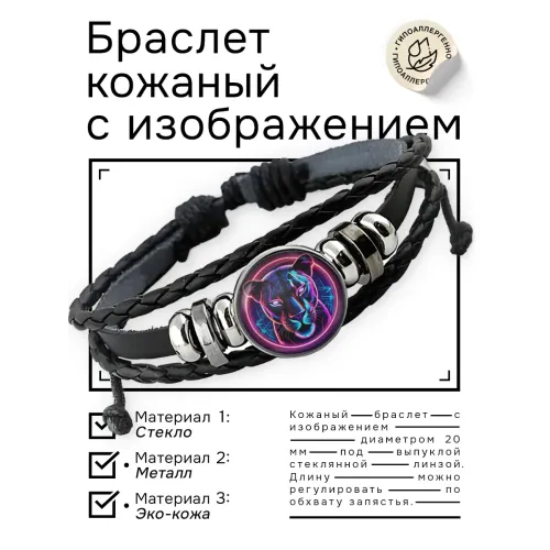 Кожаный браслет с декоративным элементом в виде изображения дикой кошки.