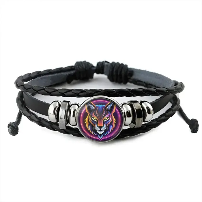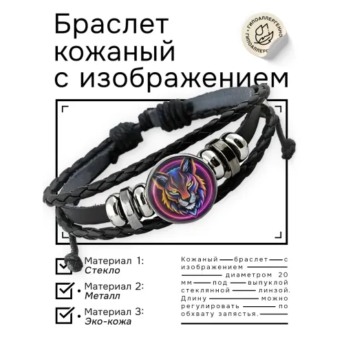 Кожаный браслет с изображением рыси. Материалы: синтетическая кожа, металл, стекло. Ключевая особенность — выпуклая стеклянная линза.