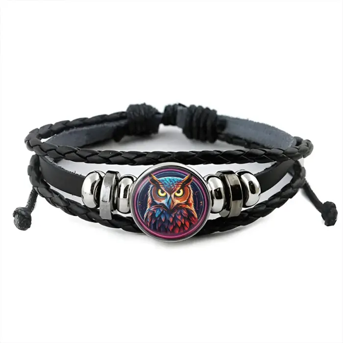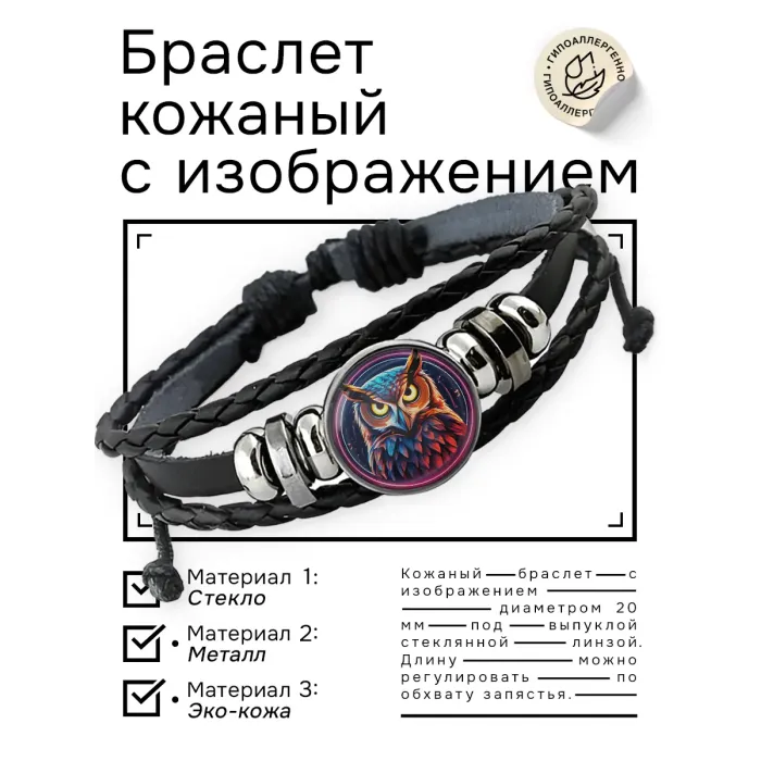 Кожаный браслет с декоративным элементом в виде совы. Изображение защищено выпуклой стеклянной линзой, размер регулируется.