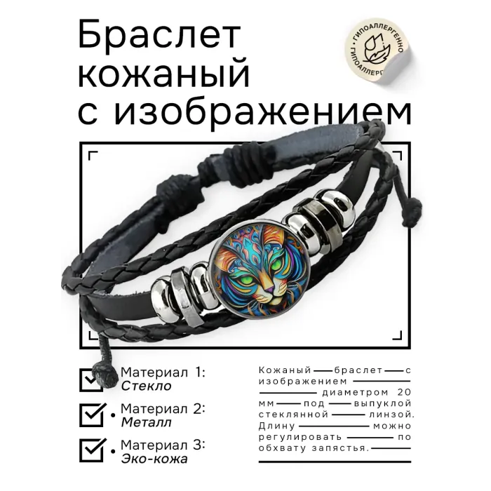 Кожаный браслет с декоративным элементом в виде кошки. Изготовлен из синтетической кожи, металла и стекла, имеет регулируемый размер.