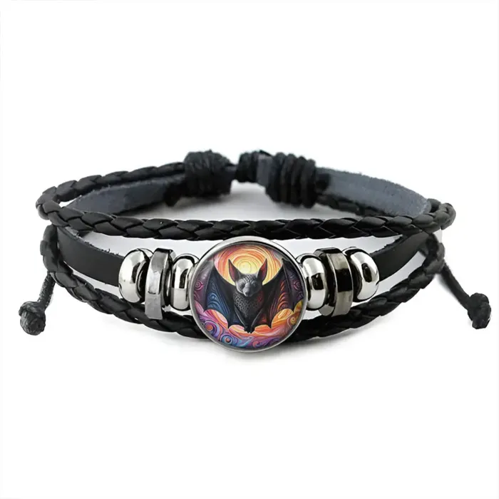 Кожаный браслет с декоративным элементом в виде летучей мыши. Изготовлен из синтетической кожи, металла и стекла.