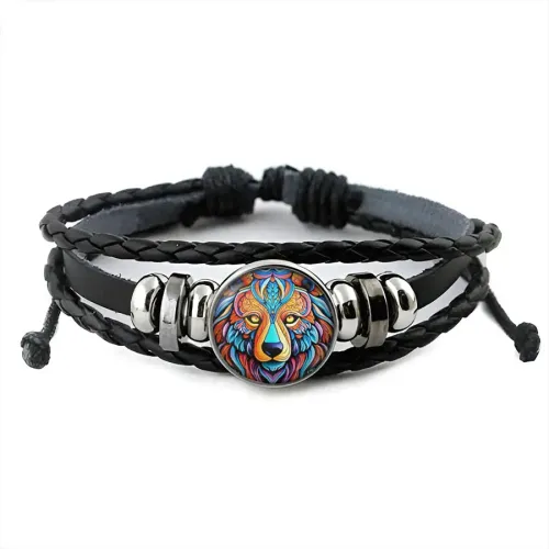 Кожаный браслет с декоративным элементом в виде медведя. Изображение защищено выпуклой стеклянной линзой.