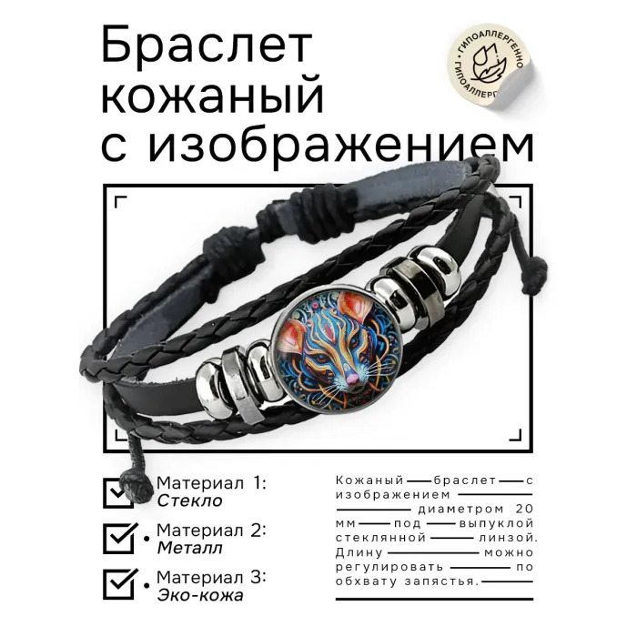 Кожаный браслет с изображением мыши. Изготовлен из синтетической кожи, металла и стекла.