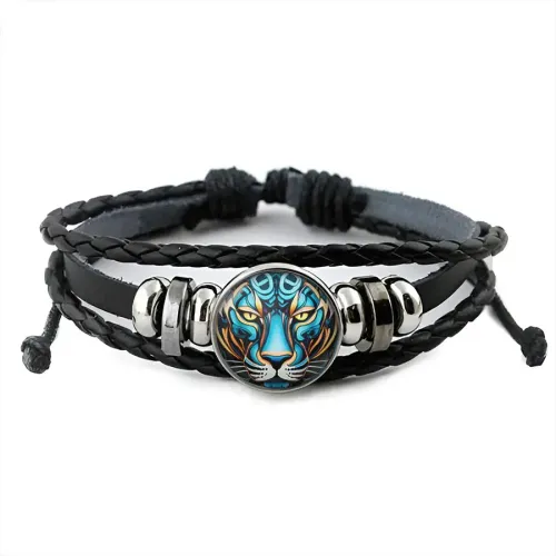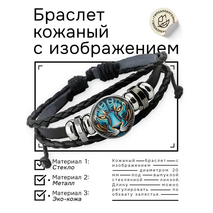Кожаный браслет с декоративным элементом в виде пантеры. Изображение защищено выпуклой стеклянной линзой, размер регулируется.
