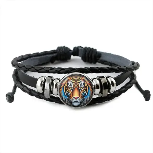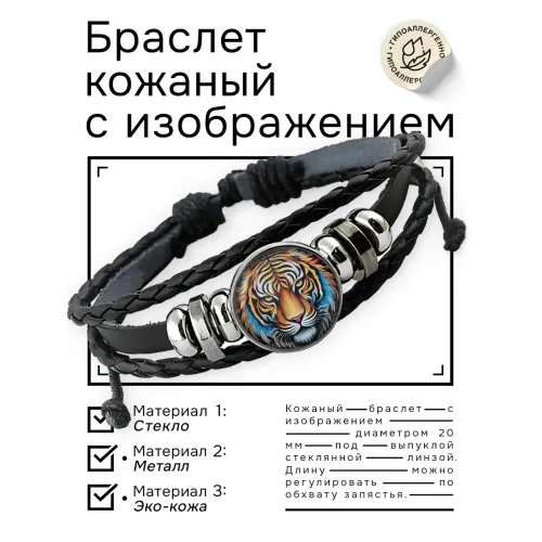 Кожаный браслет с декоративным элементом в виде изображения тигра под стеклянной линзой.