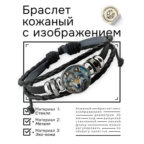 Кожаный браслет с декоративным элементом под стеклянной линзой.