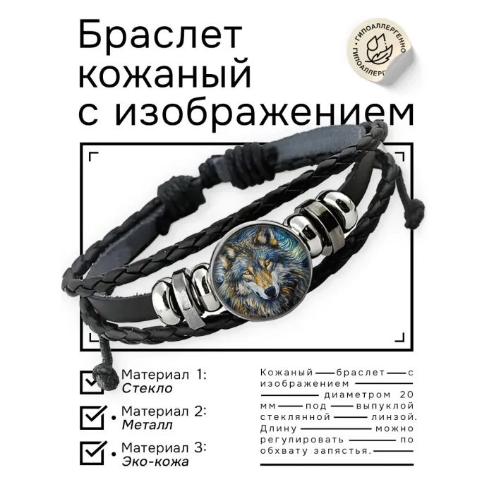 Материал и изготовление: Синтетическая кожа, металл, стекло. Изображение волка расположено под выпуклой стеклянной линзой диаметром 20 мм.