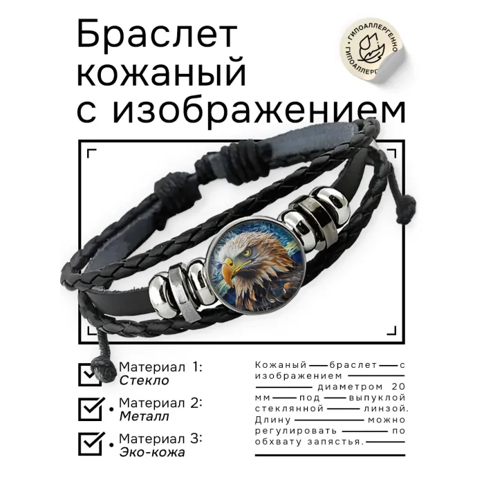 Кожаный браслет с изображением орла под выпуклой стеклянной линзой.