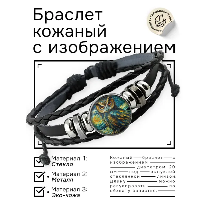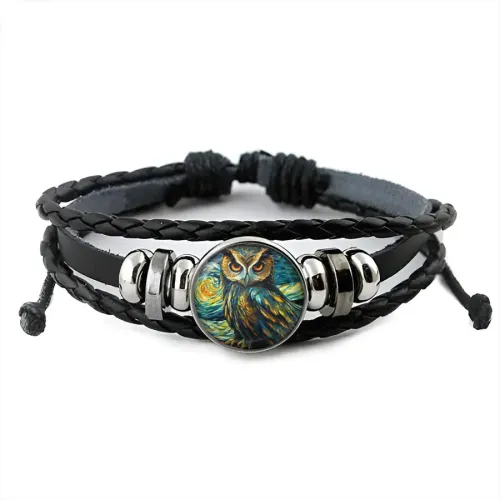 Кожаный браслет с изображением филина под выпуклой стеклянной линзой.