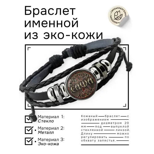 Именной кожаный браслет с регулируемым размером и изображением под стеклянной линзой.