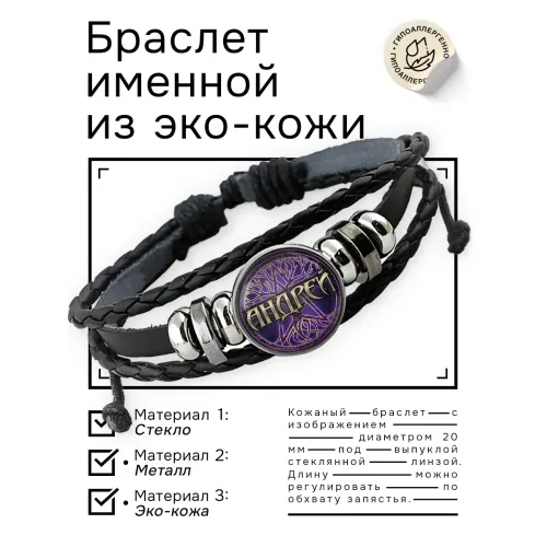 Именной браслет из синтетической кожи с регулируемой застёжкой и защищённым стеклянной линзой изображением.