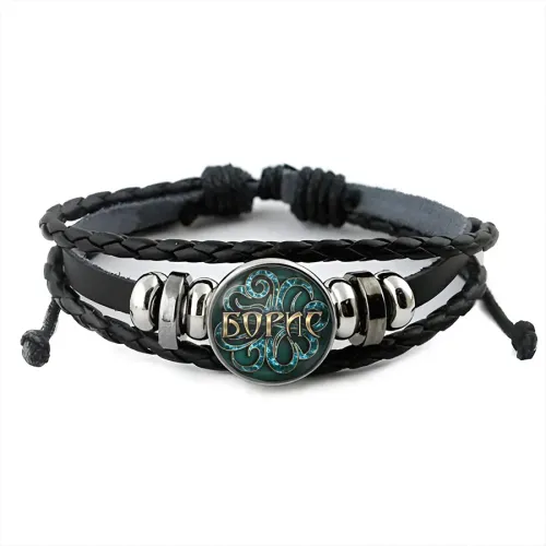 Именной кожаный браслет Борис — аксессуар из синтетической кожи с металлическими элементами, украшенный изображением под выпуклой стеклянной линзой.
