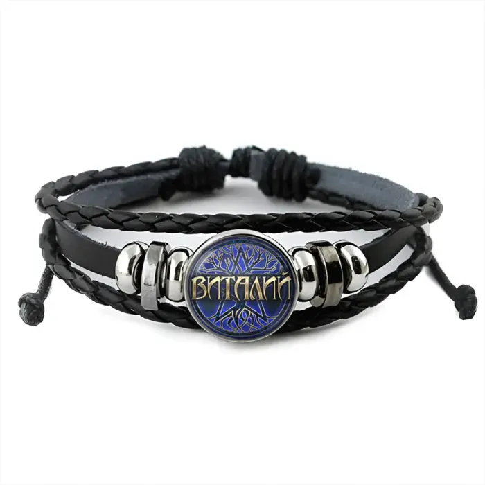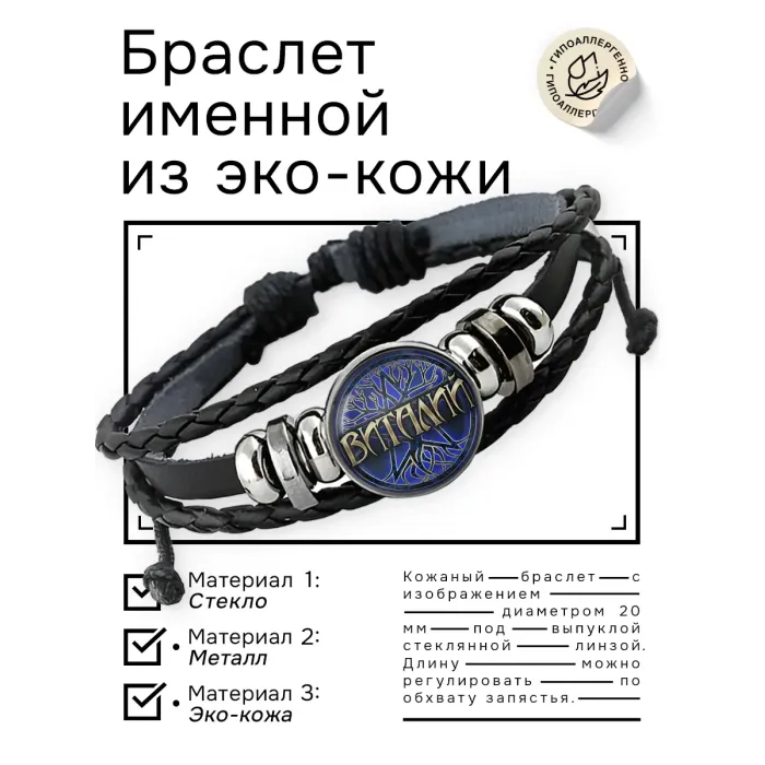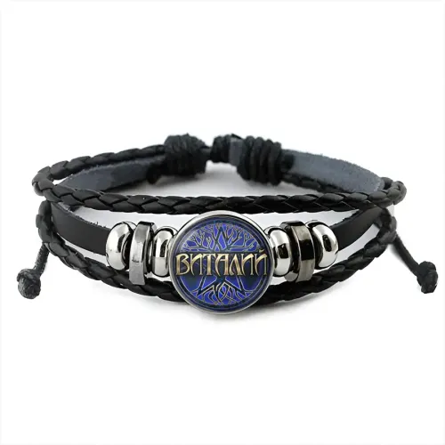 Именной кожаный браслет с регулируемым размером. Украшен изображением под выпуклой стеклянной линзой.