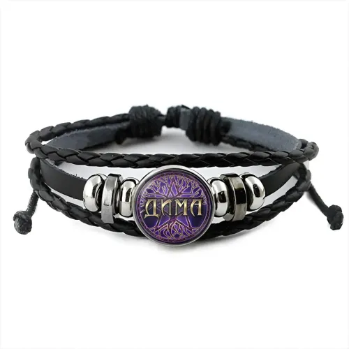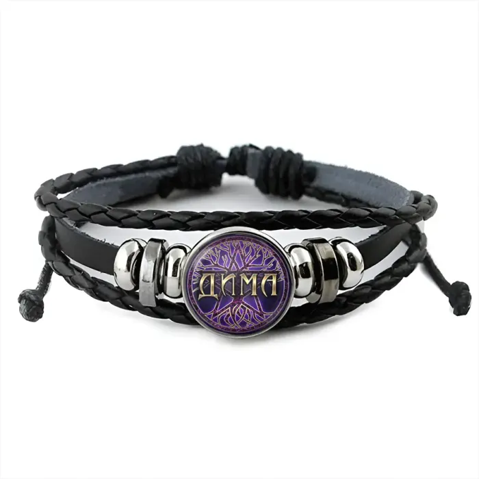 Именной кожаный браслет с символическим значением. Изготовлен из синтетической кожи, металла и стекла, имеет регулируемый размер.