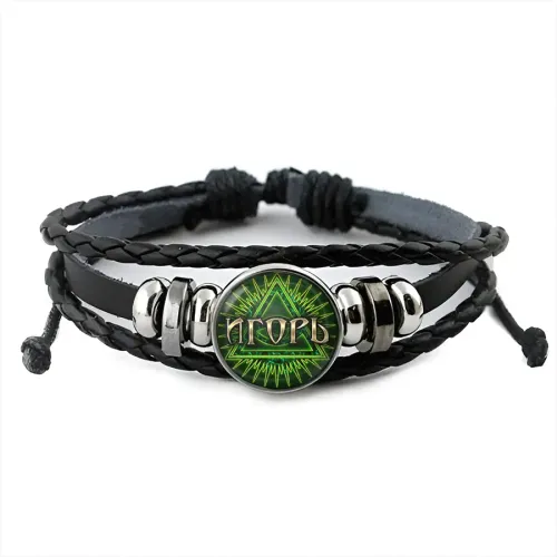 Именной кожаный браслет с регулируемым размером. Изготовлен из синтетической кожи, металла и стекла, имеет круглое изображение под выпуклой линзой.