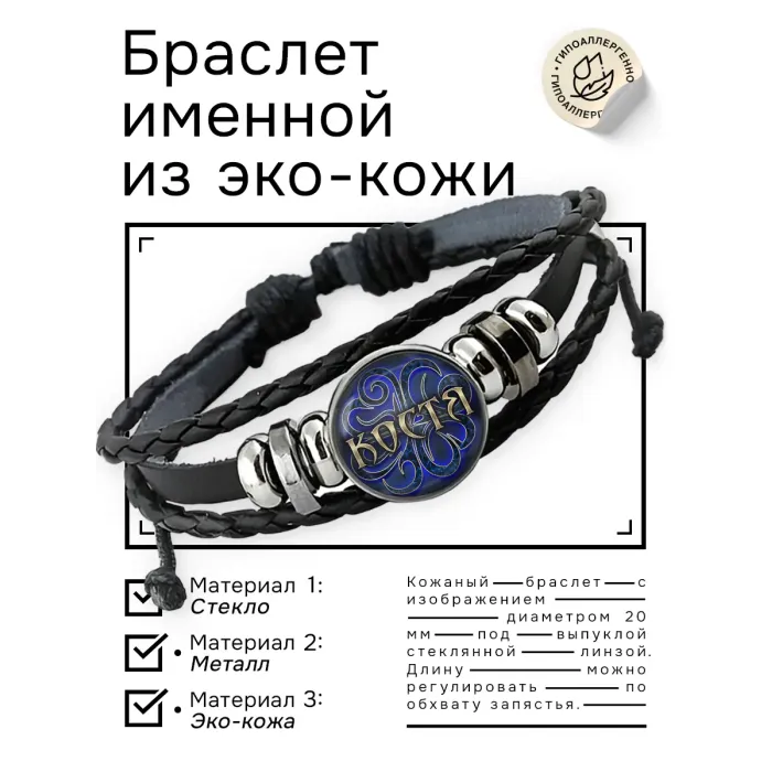 Кожаный браслет с изображением диаметром 20 мм, защищённым выпуклой стеклянной линзой. Этот аксессуар выполнен из синтетической кожи, металла и стекла, что обеспечивает долговечность и стильный внешний вид. Регулируемый по обхвату запястья, он подходит для любого размера. Именной защитный символ-талисман традиционно используется для преодоления трудностей и привлечения удачи в жизнь владельца. Упаковка представлена в прозрачном пакете, что делает его отличным подарком или сувениром.
