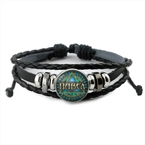 Именной кожаный браслет с защитным символом. Изготовлен из синтетической кожи, металла и стекла, украшен изображением под выпуклой стеклянной линзой.