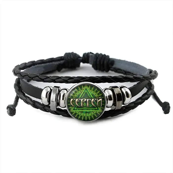 Именной кожаный браслет. Изготовлен из синтетической кожи, металла и стекла, украшен изображением под выпуклой стеклянной линзой.