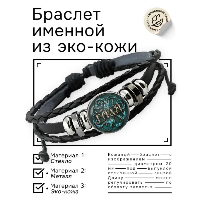Именной кожаный браслет с защитным символом. Изготовлен из синтетической кожи, металла и стекла, имеет регулируемый размер.
