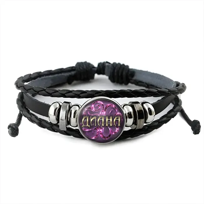 Именной кожаный браслет с декоративным элементом под стеклянной линзой.