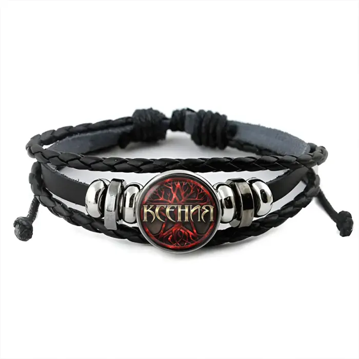 Именной кожаный браслет с металлическими элементами и изображением под выпуклой стеклянной линзой.