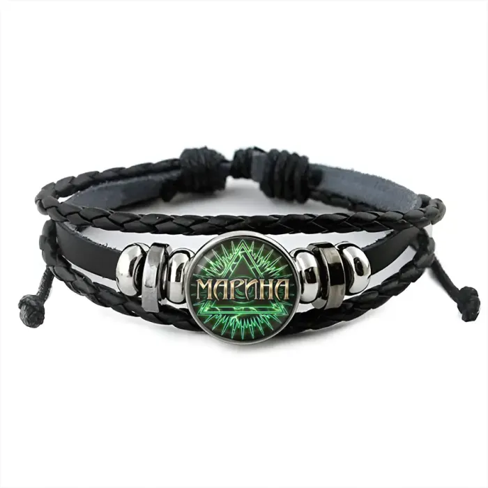 Именной кожаный браслет. Изготовлен из синтетической кожи, металла и стекла. Украшен изображением под выпуклой стеклянной линзой.