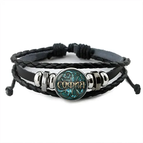 Именной кожаный браслет с декоративным элементом под стеклянной линзой.