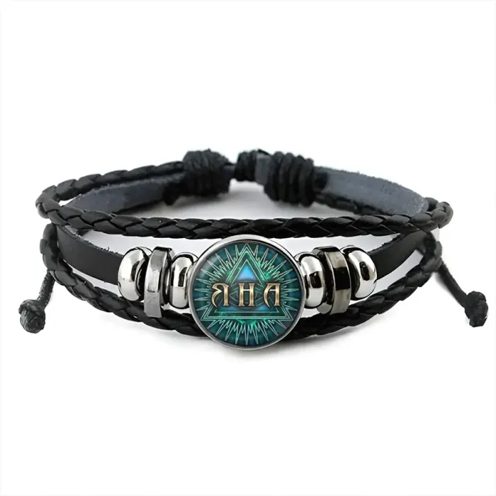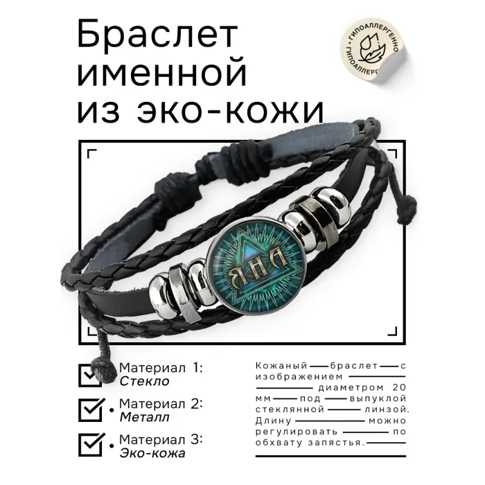 Именной кожаный браслет. Изготовлен из синтетической кожи, металла и стекла, украшен изображением под выпуклой стеклянной линзой.