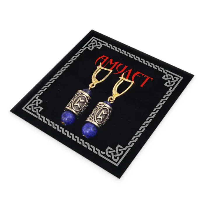 Размеры и комплектация: Высота серёг — 45 мм. Размер рунических бусин — 12х8 мм. Диаметр бусин из лазурита — 6 и 8 мм.