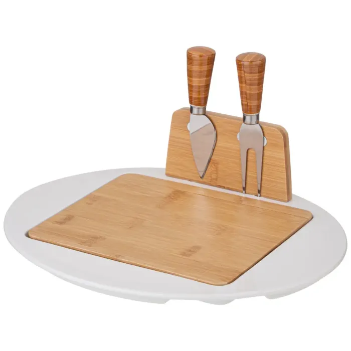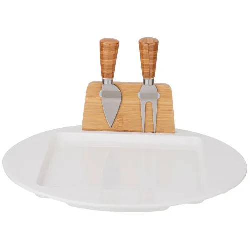 Предметы набора включают нож-лопатку для мягких сыров, вилку для средних сыров и металлическую подставку с бамбуковой основой. Фарфоровые элементы обладают прочностью и устойчивостью к высоким температурам. Бамбуковая основа придаёт конструкции устойчивость и натуральную текстуру.
