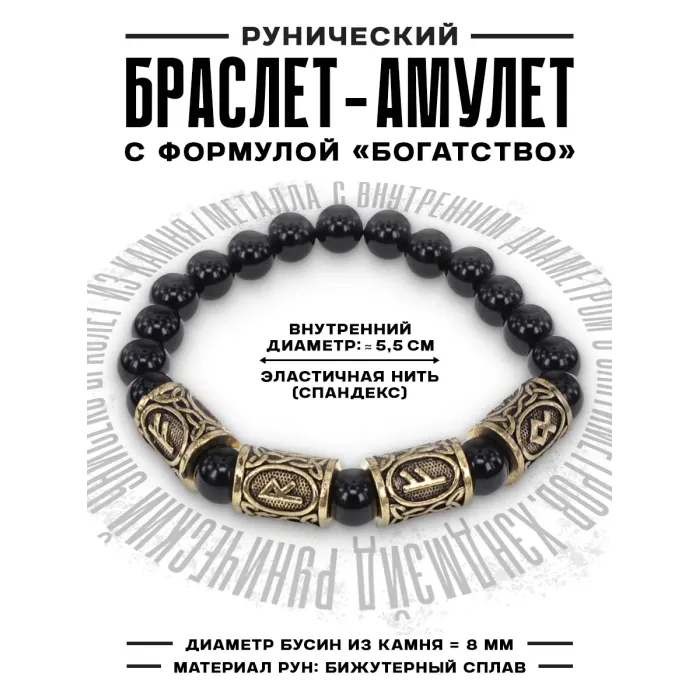 Рунический браслет Богатство и стабильный доход с нат.камнем Черный агат 8мм BSRQ-07