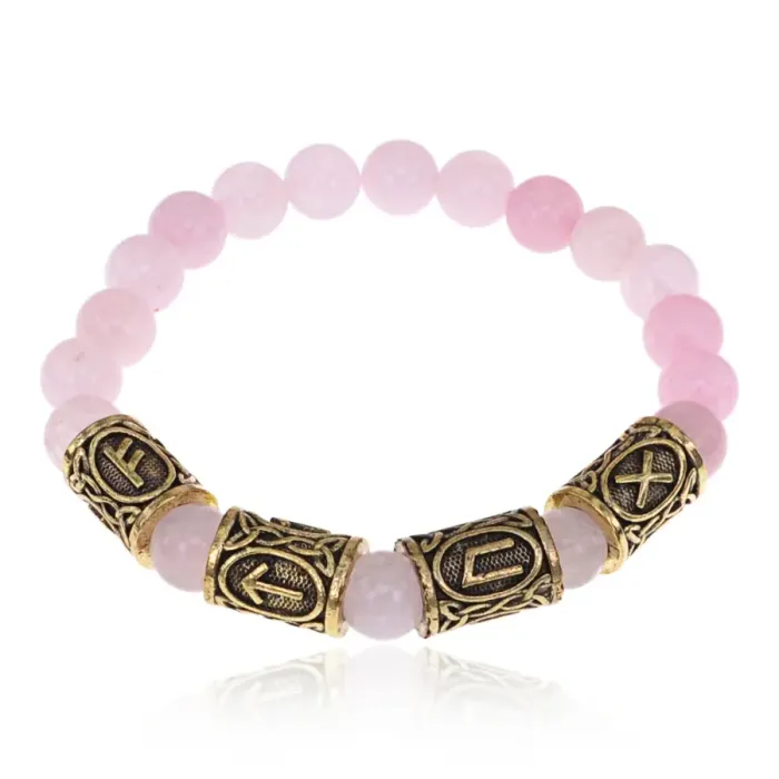 Рунический стрейч-браслет из бижутерного сплава с натуральным розовым кварцем и символами рун.