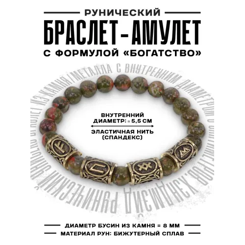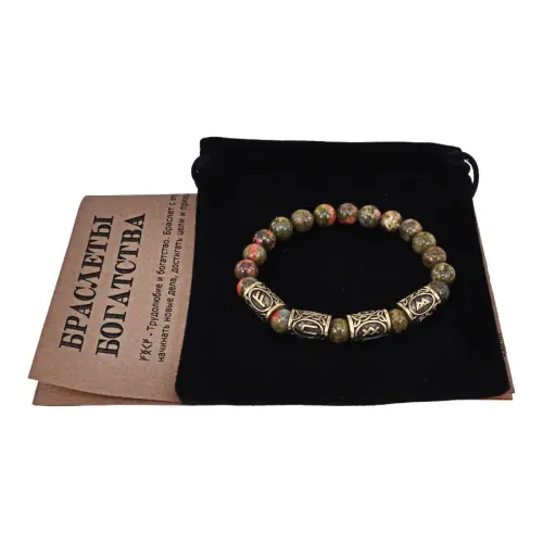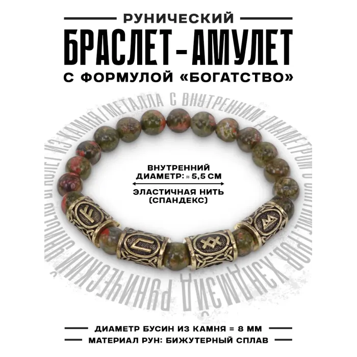 Рунический стрейч-браслет из натурального камня унакит и бижутерного сплава с символами богатства и здоровья.
