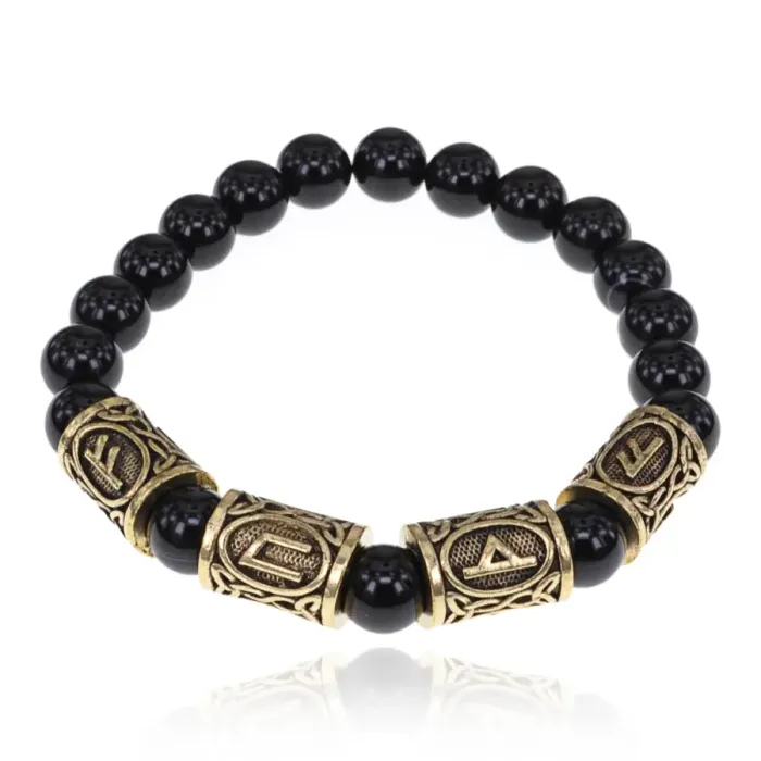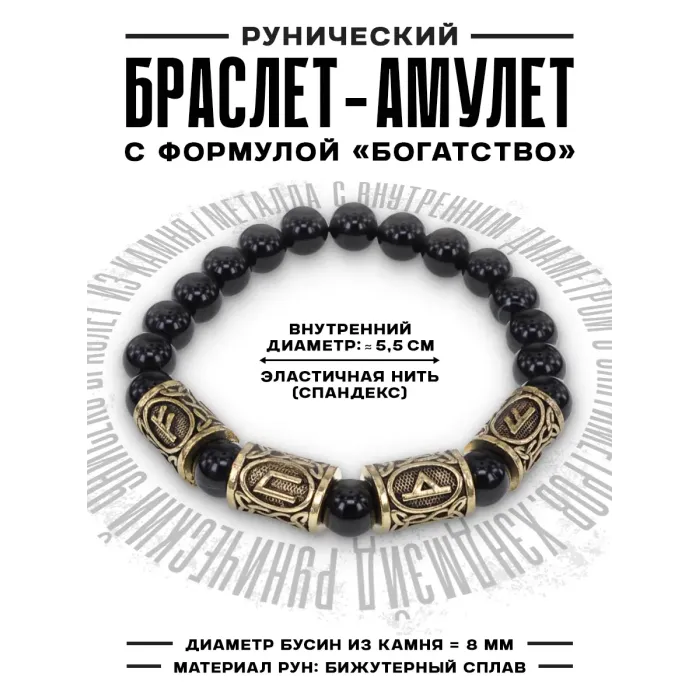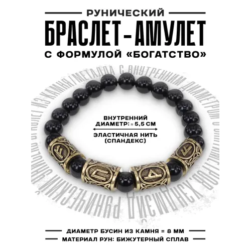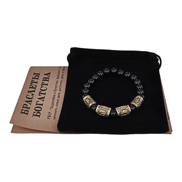 Рунический браслет Богатый инвестор с нат.камнем Черный агат 8мм BSRQ-19