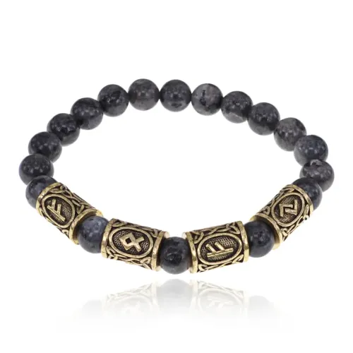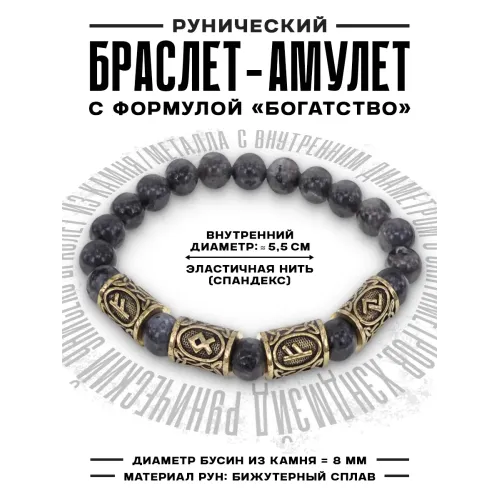 Рунический стрейч-браслет с символами богатства и преумножения. Изготовлен из бижутерного сплава с покрытием под золото и натурального камня лабрадор.