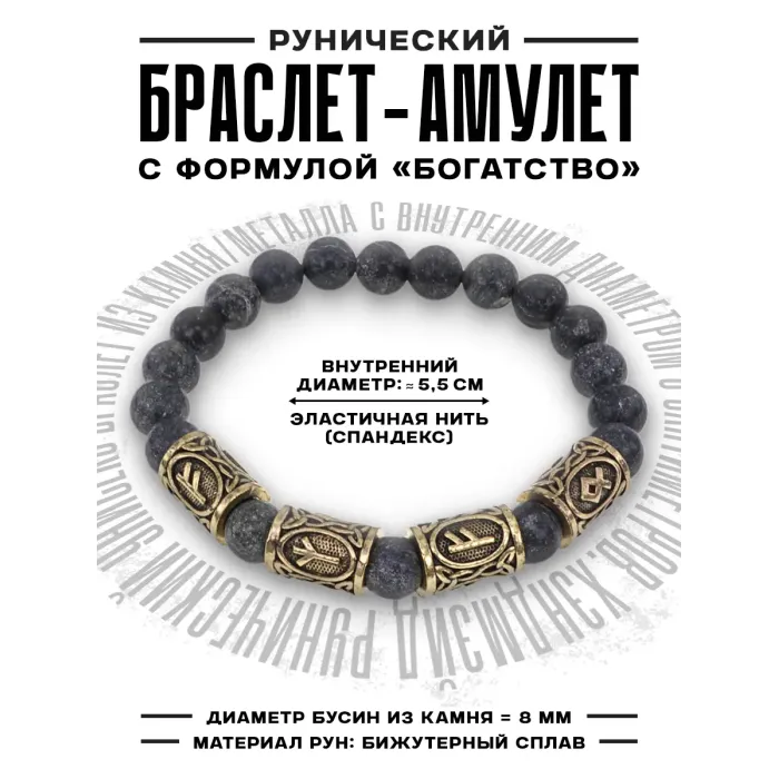Размеры и комплектация: Диаметр бусин 8 мм. Внутренний диаметр браслета ~5.5 см. В комплекте прозрачный пакет с еврослотом, бархатный мешочек и буклет с описанием значений рун и камней.