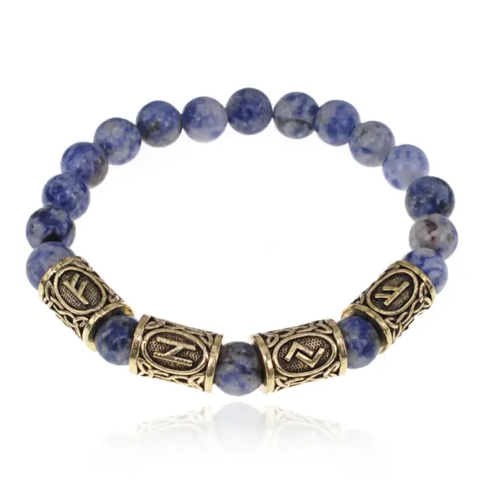 Рунический стрейч-браслет из бижутерного сплава с натуральным камнем содалит и символами рун.
