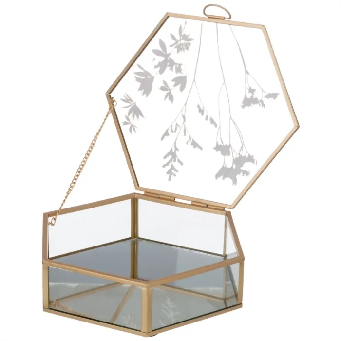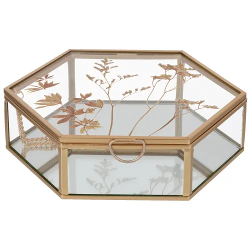Эта шкатулка сочетает в себе стильный дизайн и практичность. Прозрачное стекло позволяет видеть содержимое, а металлические элементы обеспечивают прочность конструкции. Компактные размеры делают её удобной для размещения на любом столике или полке.