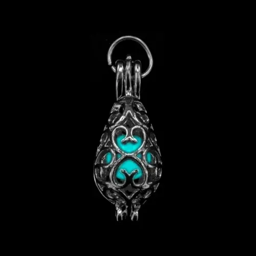 Светящийся кулон в форме капли. Изготовлен из бижутерного сплава с покрытием под серебро, заряжается от света.
