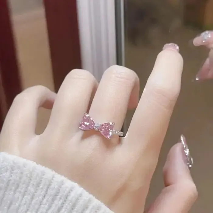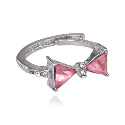Безразмерное кольцо в форме банта из бижутерного сплава с покрытием под серебро и декоративными вставками.
