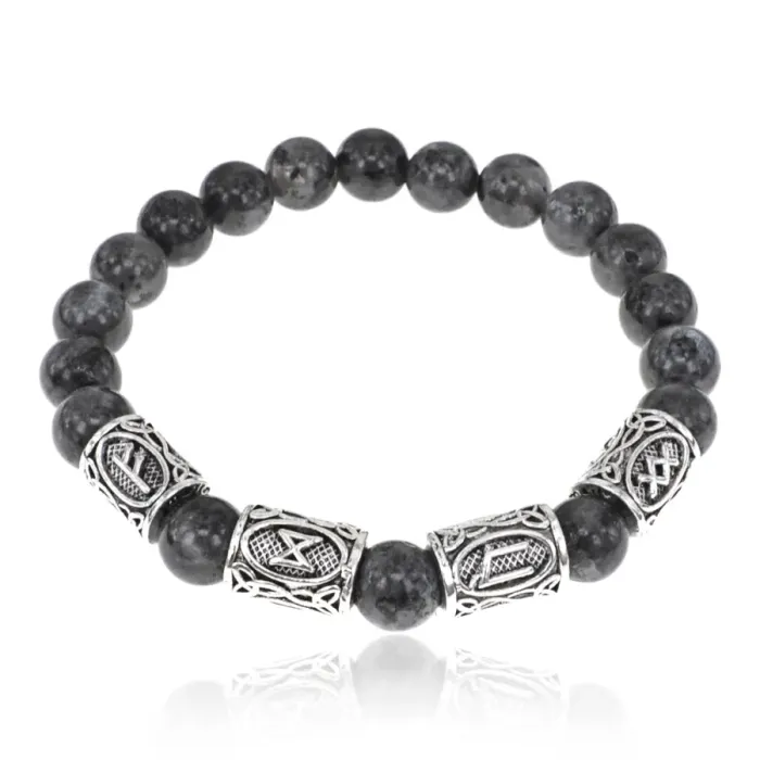 Рунический стрейч-браслет из бижутерного сплава с натуральным камнем змеевик и символами богатства и силы.
